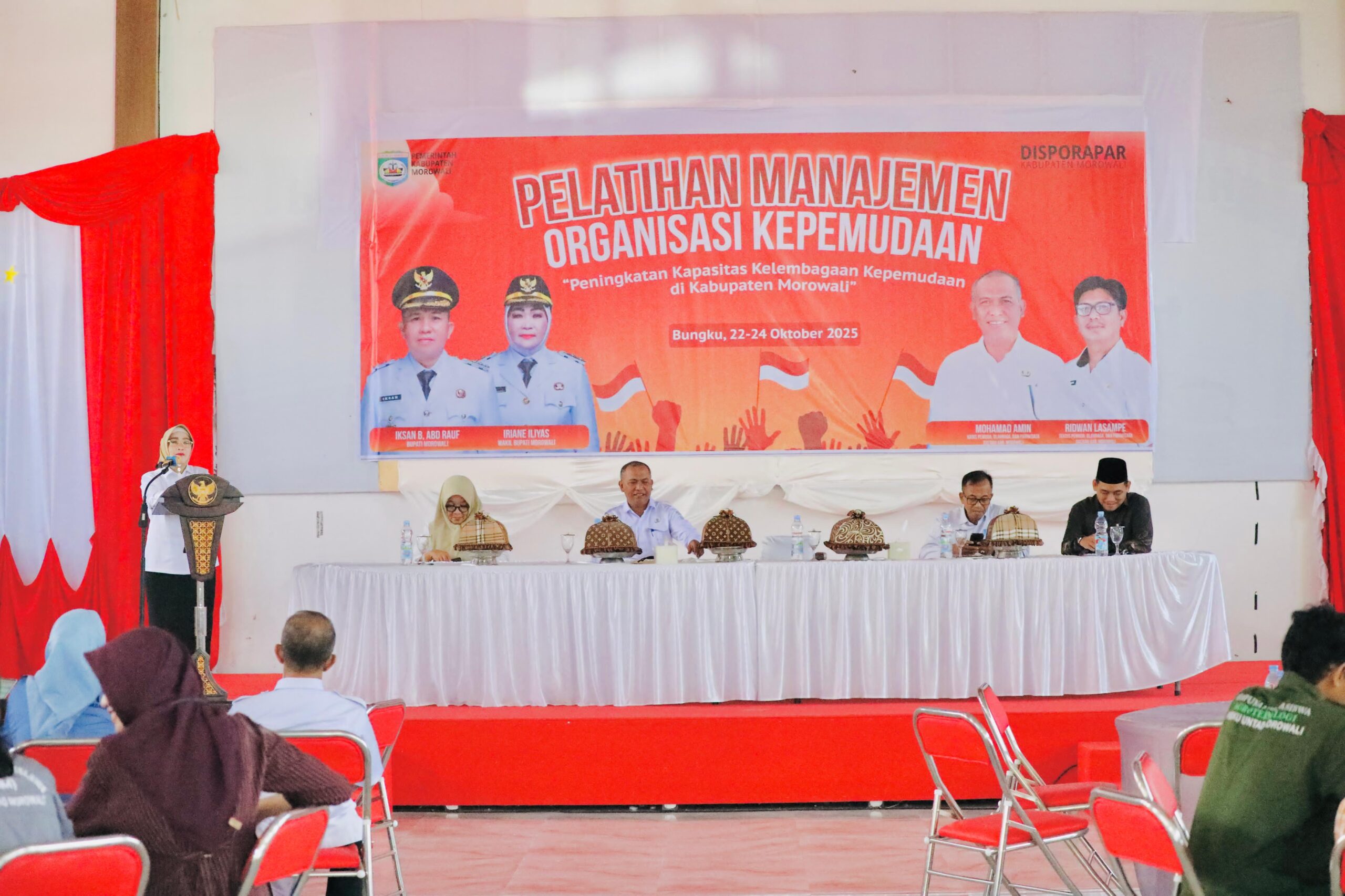 Kegiatan tersebut secara resmi dibuka oleh Wakil Bupati Morowali, Iriane Iliyas, S.E., dan dihadiri oleh Kepala Dinas Pemuda, Olahraga, dan Pariwisata Daerah Kabupaten Morowali, Ir. Mohamad Amin, S.T., M.T., Sekretaris Badan Kesbangpol Morowali, Sukman Gamal, S.P., perwakilan Dinas Koperasi dan UMKM Morowali, para narasumber, staf Disporapar, insan pers, serta peserta pelatihan yang berasal dari organisasi Karang Taruna dan organisasi kemahasiswaan.