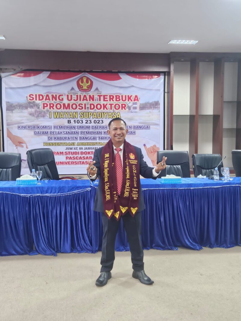 Dr. I Wayan Supadiyasa dinyatakan lulus setelah mempertahankan disertasi berjudul “Kinerja Komisi Pemilihan Umum Daerah Kabupaten Banggai dalam Pelaksanaan Pemilihan Kepala Daerah di Kabupaten Banggai Tahun 2024” di hadapan dewan penguji.