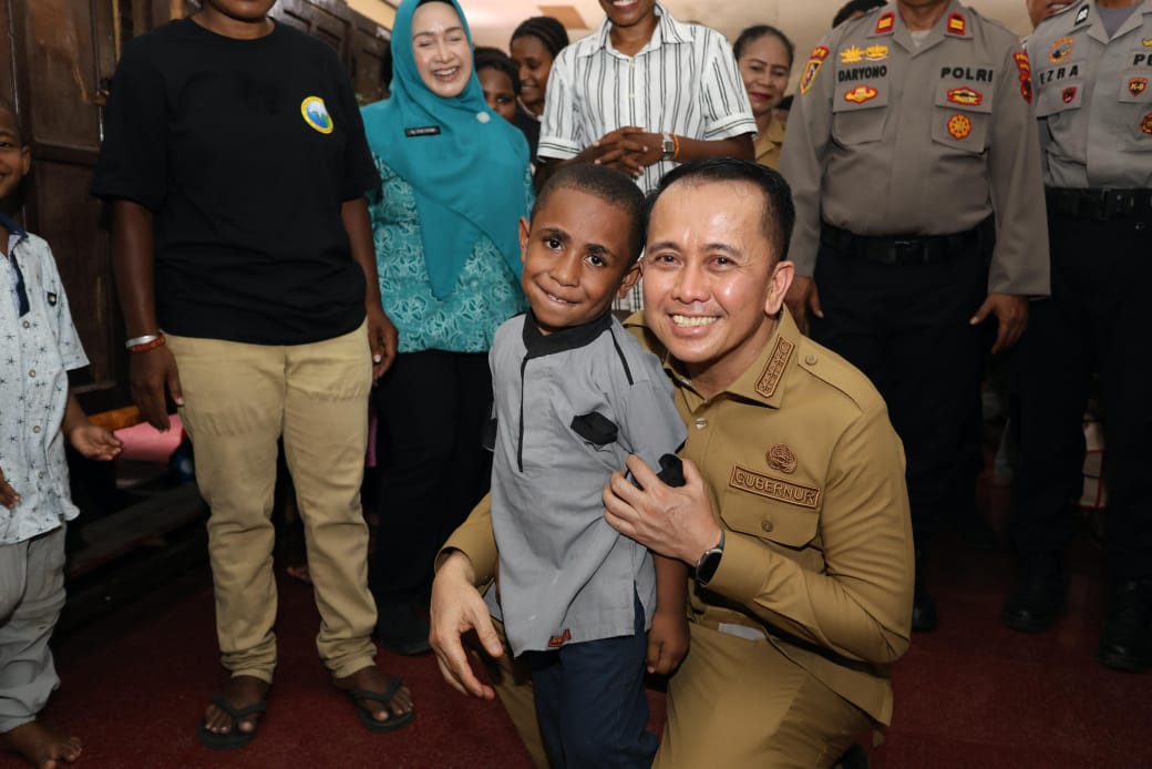 dteksinews, Jayapura-Penjabat (Pj) Gubernur Papua Agus Fatoni bersama Pj. Ketua TP PKK Tyas A. Fatoni mengunjungi anak-anak Panti Asuhan Pembawa Terang Holtekamp yang saat ini sementara menempati asrama SPN Polda Papua, Jayapura, Papua, Senin (6/10/2025).