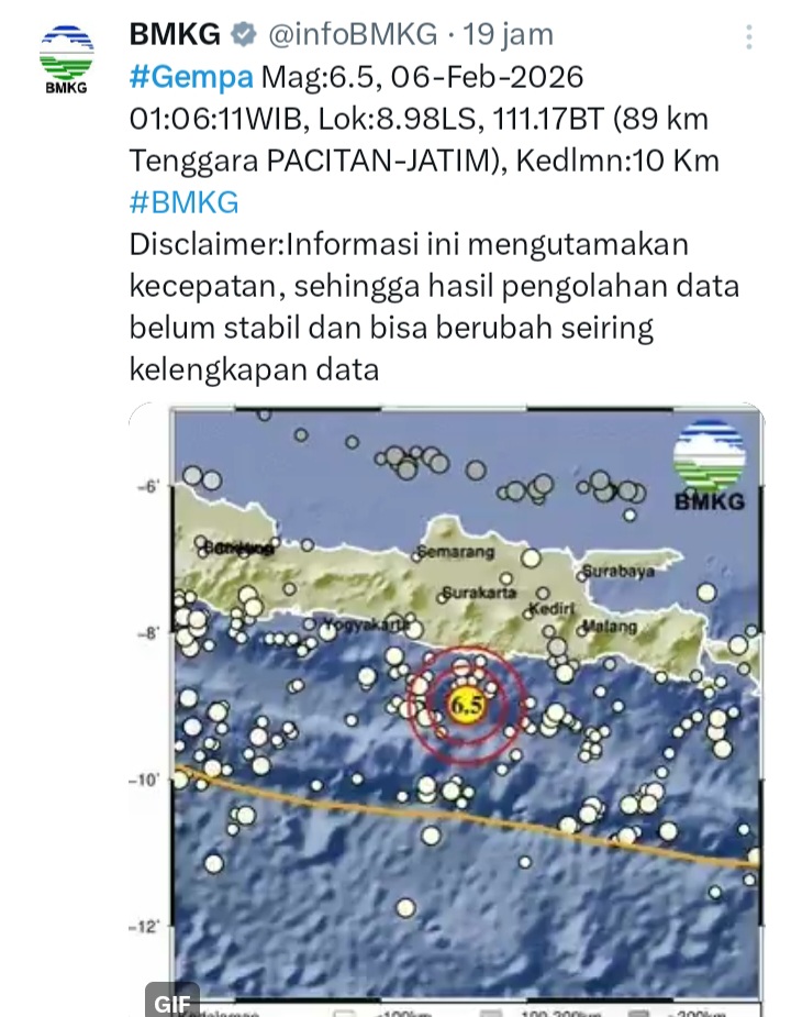 Gempa bumi berkekuatan 6.5 Mag, terjadi pada hari jumat tanggal 6 Februari 2026 01:06:11 WIB, lokasi :8.98 ls,111.17 BT(89 km Tenggara Pacitan- Jatim).Kedalaman :10 km.