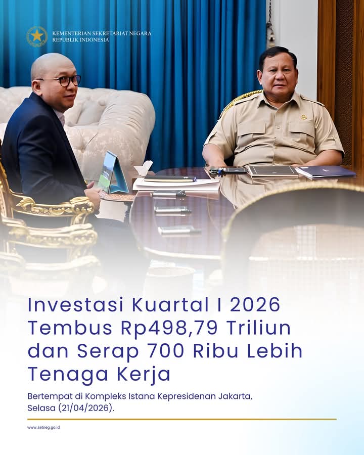 Dalam keterangannya kepada awak media di Kompleks Istana Kepresidenan Jakarta, Selasa (21/04/2026), Rosan menyampaikan bahwa capaian tersebut mengalami peningkatan 7,22 persen dibandingkan tahun sebelumnya, dengan penyerapan tenaga kerja Indonesia mencapai 706.569 orang, atau tumbuh sebesar 18,93 persen (yoy).