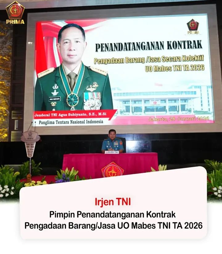 dteksinews, Jakarta- Panglima TNI Jenderal TNI Agus Subiyanto yang diwakili Inspektur Jenderal (Irjen) TNI Laksdya TNI Hersan memimpin acara Penandatanganan Kontrak Pengadaan Barang/Jasa secara kolektif UO Mabes TNI Tahun Anggaran 2026. Kegiatan tersebut berlangsung di Aula Gatot Subroto Mabes TNI, Cilangkap, Jakarta Timur, Rabu (28/01/2026).