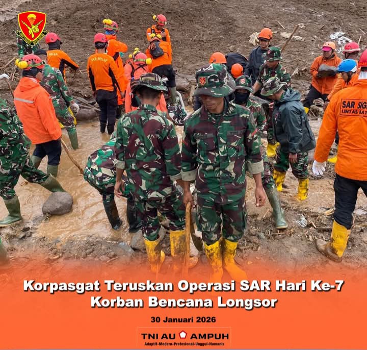 dteksinews, Bandung  Barat-Personel Korps Pasukan Gerak Cepat (Korpasgat) TNI AU bersama unsur terkait terus melaksanakan upaya maksimal guna menemukan korban yang masih dinyatakan hilang pada Operasi Pencarian dan Pertolongan (SAR) korban bencana tanah longsor di Desa Pasirlangu, Kecamatan Cisarua, Kabupaten Bandung Barat memasuki hari ke-7, Jumat (30/01/2026).