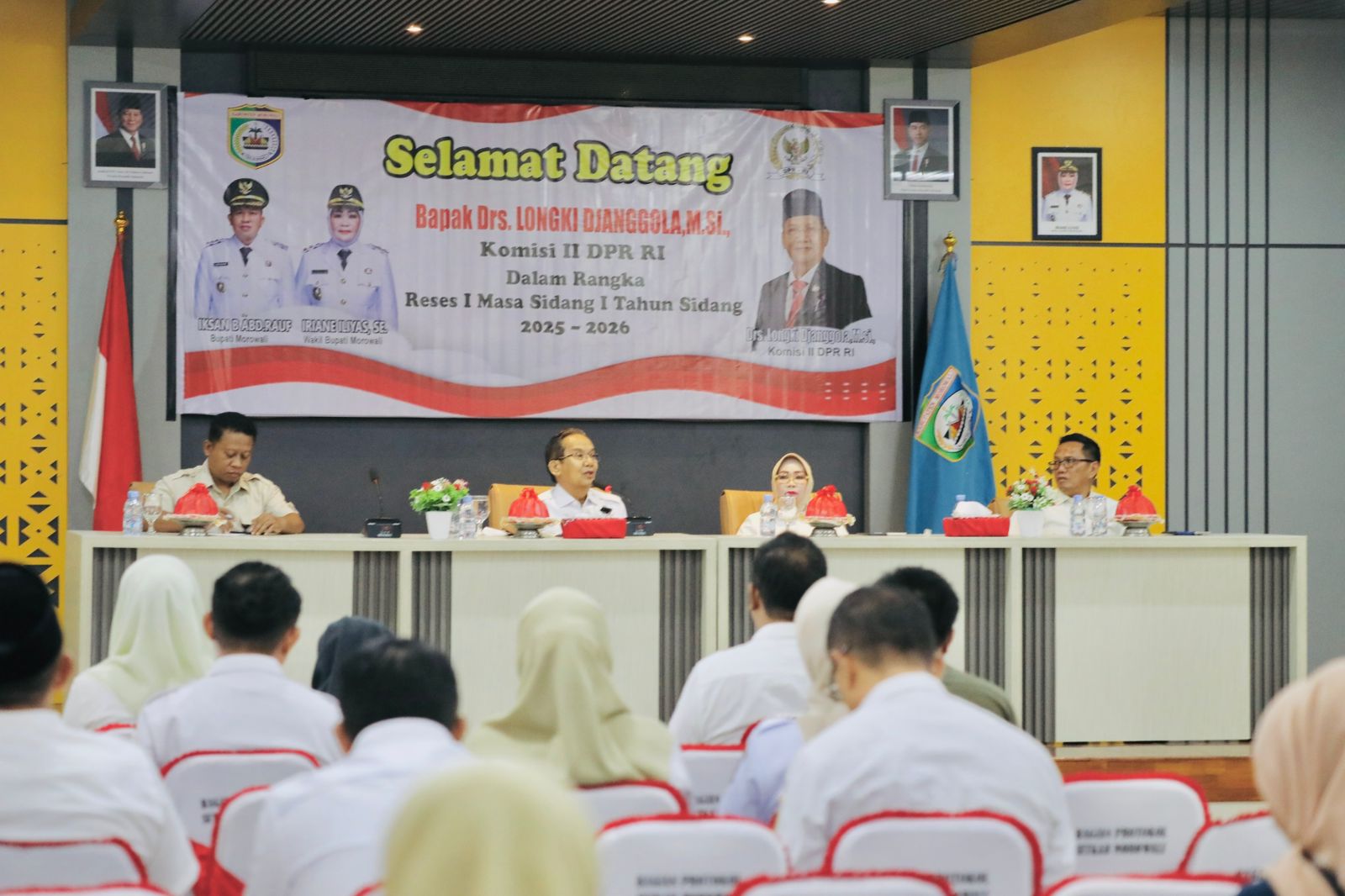 dteksinews, Morowali – Pemerintah Kabupaten Morowali menyambut hangat kunjungan kerja Anggota Komisi II DPR RI, Drs. H. Longki Djanggola, M.Si, dalam rangka Reses Masa Sidang I Tahun 2025–2026, yang digelar di Aula Kantor Bupati Morowali, Rabu (8/10/2025).