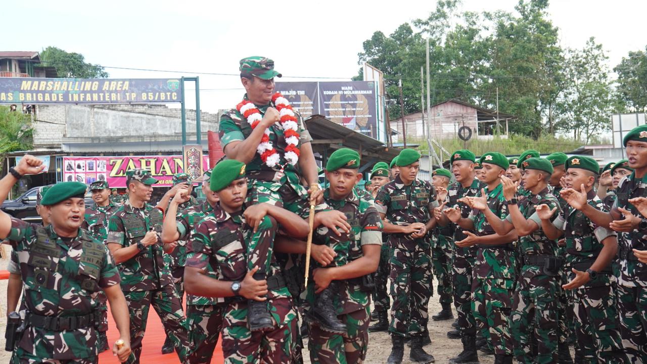 Danbrigif TP 85/BTC Kolonel Inf Alzaki, S.E., M.B.A., M.M.A.S. memimpin langsung penyambutan bersama para komandan satuan dan perwira. Jajaran prajurit Brigif TP 85/BTC, Yonif TP 827/MCY, dan Kodim 0912/Kbr berbaris rapi memberikan penghormatan, diawali laporan, pengalungan bunga, hormat jajar, pertunjukan tari dan nyanyian penyambutan, hingga sesi foto bersama.