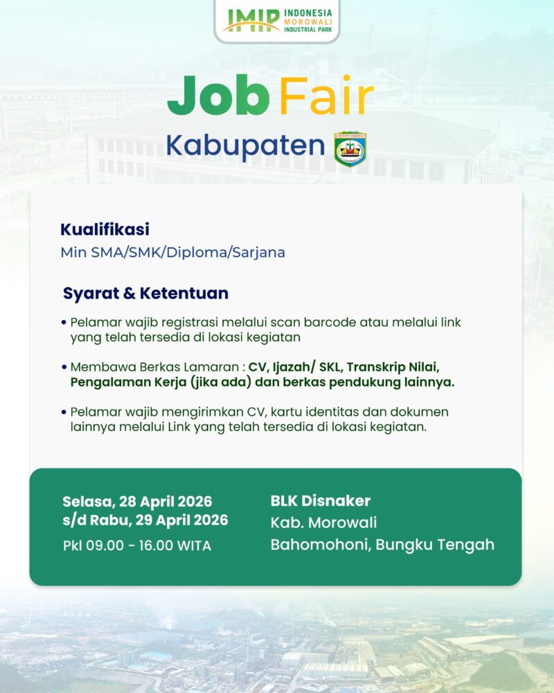 dteksinews, Morowali- PT Indonesia Morowali Industrial Park ( IMIP) secara resmi membuka Job Fair bagi warga Morowali khususnya dan umumnya Indonesia tahun 2026.