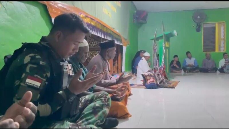 Suasana hikmad, personel Satgas Pamtas Kewilayahan RI-PNG Yonif 410/Alg mengikuti peringatan Isra Miraj Nabi Muhammad SAW,(foto:ist)