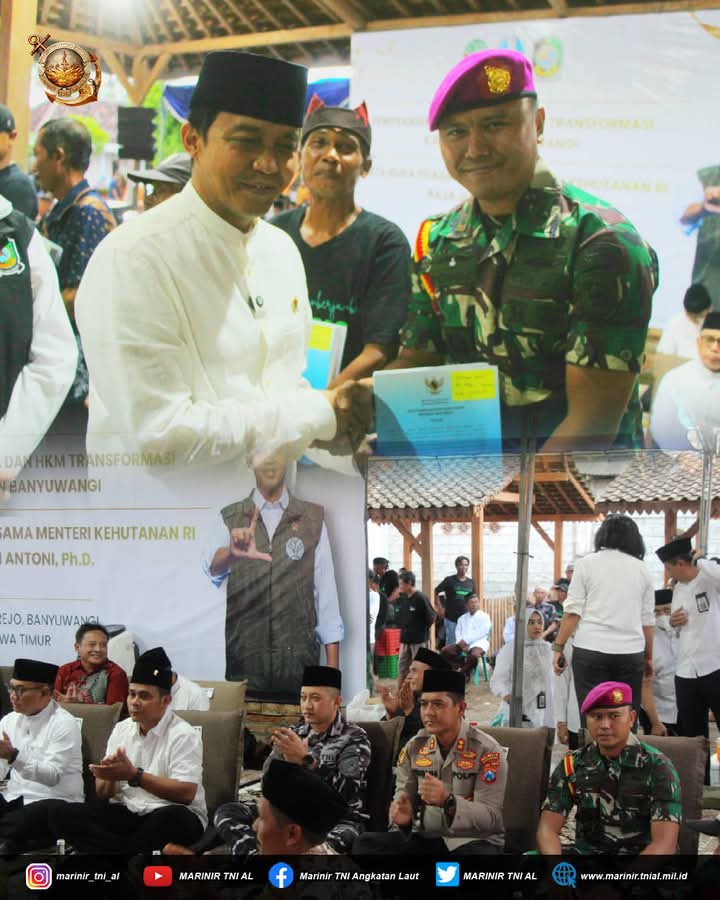 dteksinews, Banyuwangi-Kormar (Banyuwangi)- Komandan Pusat Latihan Pertempuran Marinir (Danpuslatpurmar)7 Lampon menghadiri acara kegiatan penyerahan SK Biru dan HKM Tranformasi Program Tora oleh Menteri Kehutanan RI, sekaligus menerima Sertifikat Tanah Mako Puslatpurmar 7 Lampon, bertempat di Balai Desa Temurejo Kec. Bangorejo, Banyuwangi. Sabtu (21/02/2026).