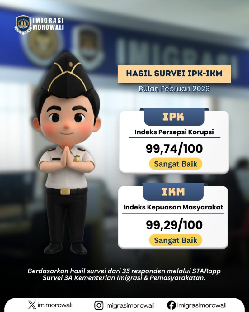 dteksinews, Morowali- Kantor Imigrasi Kelas I TPI Morowali mencatat capaian positif dalam pelaksanaan *Survei Indeks Persepsi Korupsi (IPK) dan Indeks Kepuasan Masyarakat (IKM) periode Februari 2026*. Survei ini menghasilkan nilai IPK sebesar 99,74 dan IKM sebesar 99,29, yang menunjukkan tingginya tingkat kepercayaan serta kepuasan masyarakat terhadap pelayanan keimigrasian.Kamis(5/3/2026)