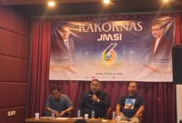 Ketua Umum JMSI, Teguh Santosa saat menyampaikan laporan pertangungjawab Pengurus JMSI Pusat periode 2020 – 2025 di arena Munas, Minggu (22/06/2025). FOTO : WARTASULAWESI.COM…