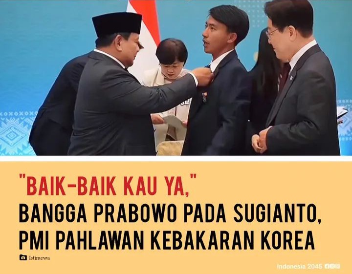 dteksinews, Korea Selatan,Presiden Prabowo Subianto tak kuasa menyembunyikan rasa bangga yang mendalam saat bertemu langsung dengan Sugianto, seorang pekerja migran Indonesia asal Indramayu, yang berhasil menyelamatkan tujuh lansia dari kebakaran hutan di Yeongdeok, Korea Selatan pada Maret 2025.