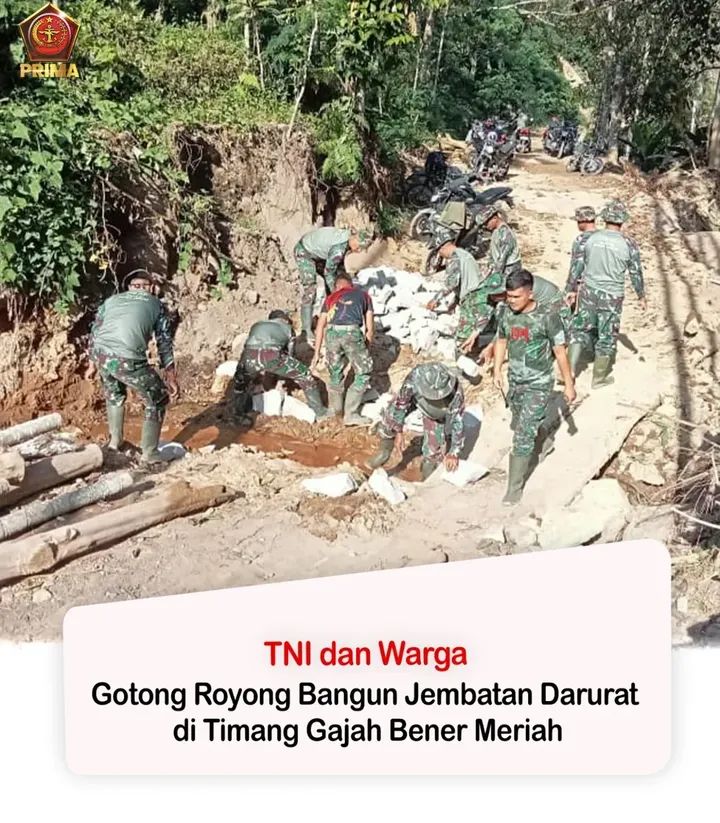 TNI dan Warga Gotong Royong Bangun Jembatan Darurat di Timang Gajah Bener Meriah
